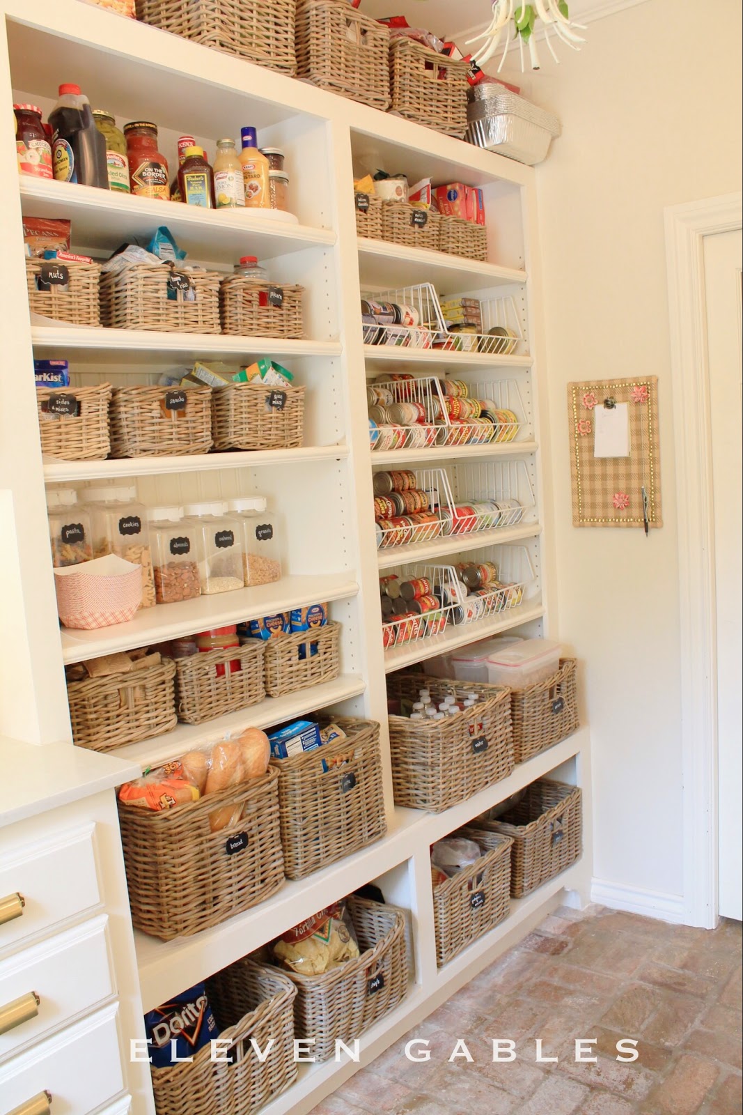 Larger baskets labeled with categories such as breakfast foods, chips, breads, and pasta keeps the bulky items tidy and easy to reach. Smaller baskets are labeled spices, nuts, sides, baking, etc. A top shelf is designated for the “extras”… things I use often enough to have a spare on hand.