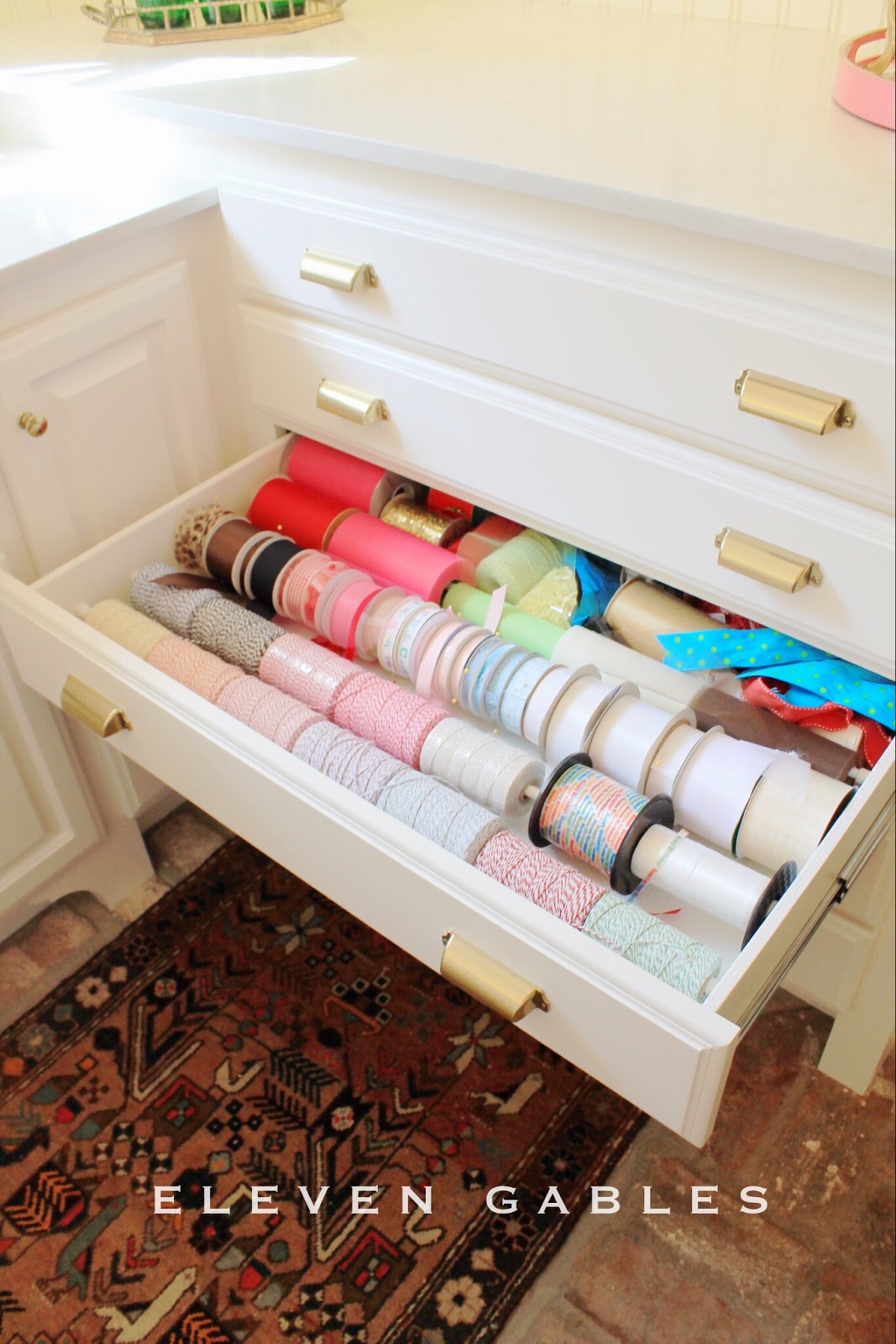 Continuing the theme of “everything has a place,” tension rods inside a drawer are magical! They keep ribbon and twine neatly in their place.